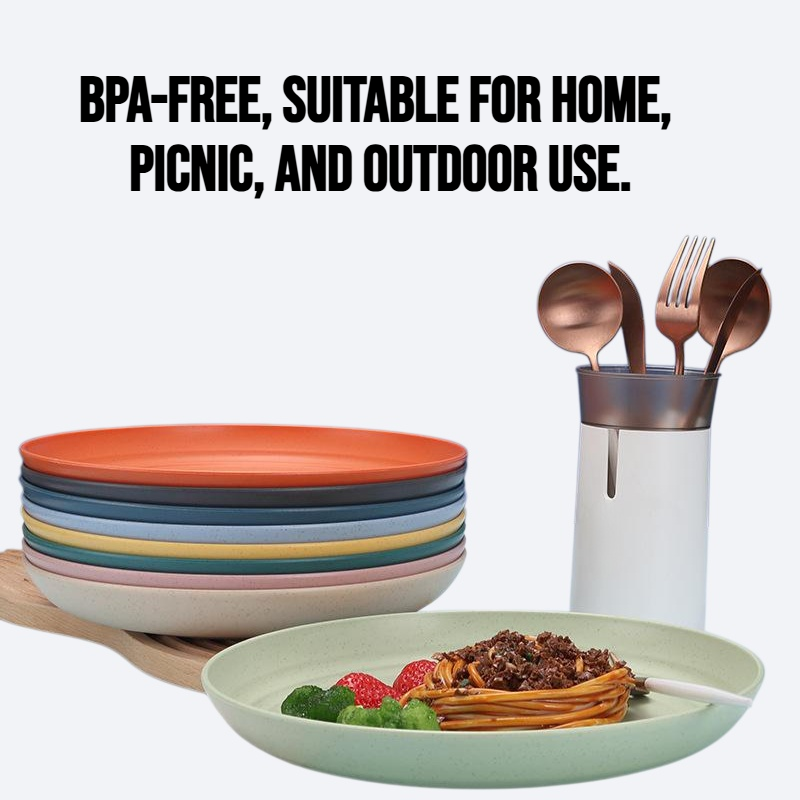 Wheat straw dinner plate is eco-friendly, reusable, lightweight, microwave and dishwasher safe, BPA-free, suitable for home, picnic, and outdoor use.